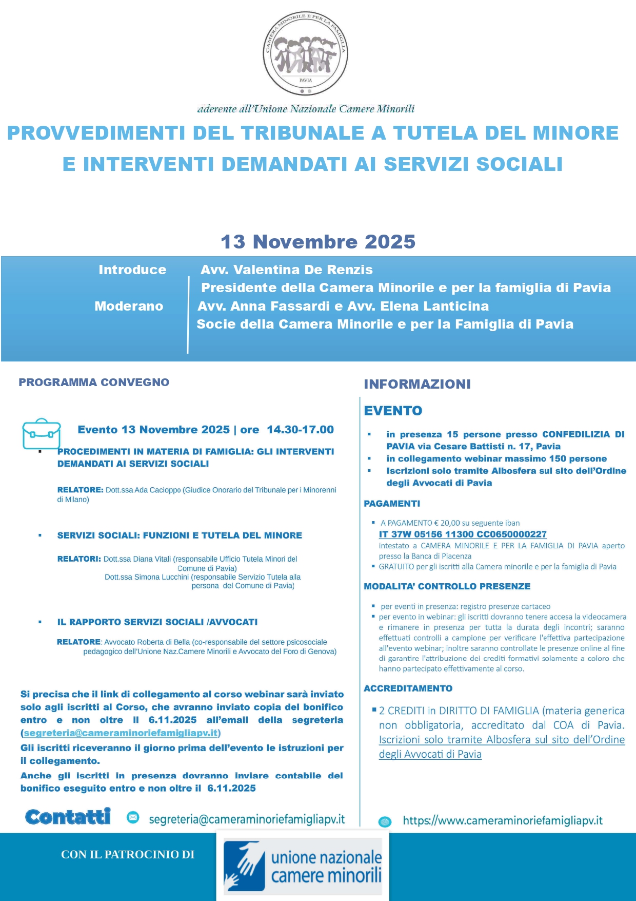 Convegno, Provvedimenti del Tribunale a tutela del minore e interventi demandati al servizio sociale, 13.11.2025, ore 14:30 – 17, Confedilizia di Pavia, via Cesare Battisti n. 17 o collegamento webinar